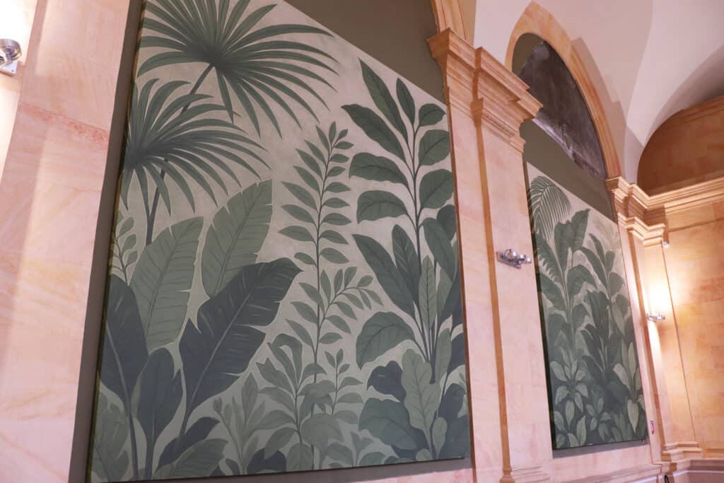 Cadres en toile imprimée intégrés aux murs, combinant traitement acoustique et apport décoratif.